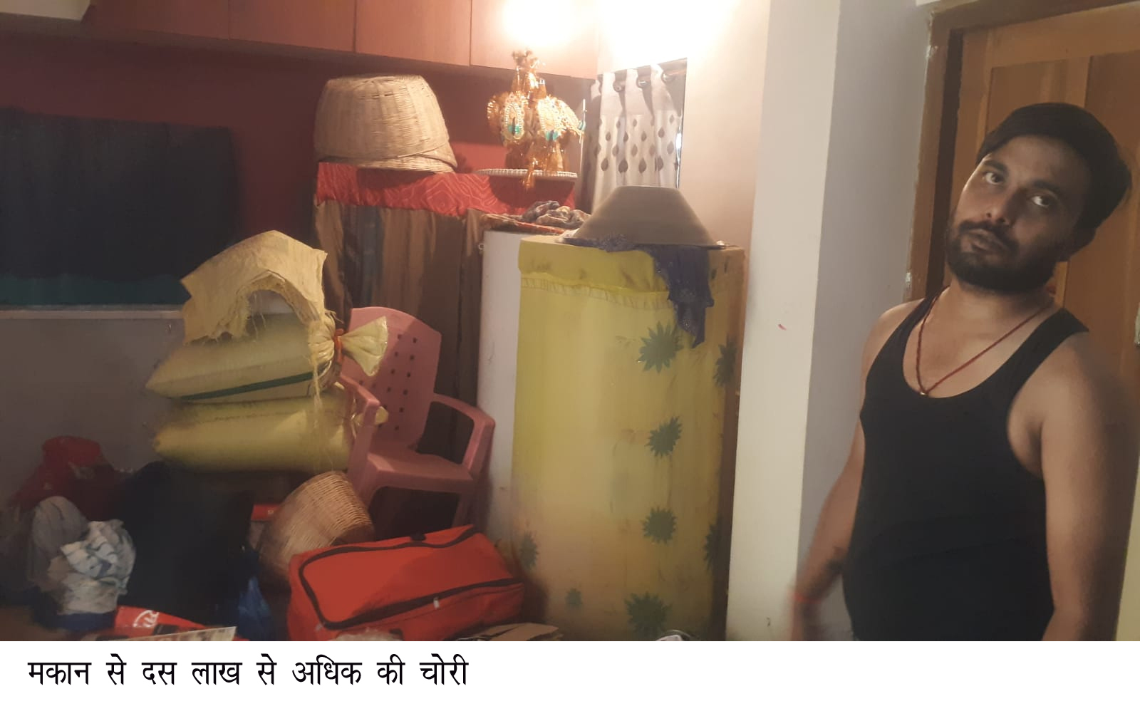 पीड़ित किरण सिन्हा और पुत्र अभिषेक कुमार सिन्हा ने बताया कि नीचे घर में परिवार के लोग सो रहे थे. इसी बीच चोरों ने लगभग सोने-चांदी के आभूषण और पीतल कांसा के बर्तन, साड़ी कपड़ा और कुछ नकद रुपये चोरी कर लिया है. जो दस लाख से अधिक का है. पीड़ितों ने बताया कि सुबह जब जागे तो देखा कि छत पर स्थित कमरों में ताला टूटा पड़ा है. घर में सामान बिखरा है. इसके बाद छत के बाहर का दरवाजा भी बंद है. किसी तरह आसपास के लोगों को बुल कर बाहर से दरवाजा खुलवाया.