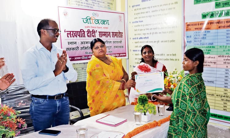 संवाददाता, पटना: महाराष्ट्र के जलगांव में आयोजित लखपति दीदी सम्मान समारोह में वर्जुअल माध्यम से पटना जिले की 1127 लखपति दीदियां शामिल हुईं. समारोह में पीएम नरेंद्र मोदी ने लखपति दीदियों के साथ संवाद करने के साथ सम्मानपत्र देकर सम्मानित किया. आजीविका के क्षेत्र में प्रेरक कार्य करने व समाज में महिला सशक्तीकरण का परचम लहराने के लिए जिले में संकुल संघों द्वारा लखपति दीदियों को सम्मान पत्र देकर सम्मानित किया गया. जिले के सभी प्रखंडों में क्लस्टर लेवल फेडरेशन (सीएलएफ) पर समारोह आयोजित हुआ. इस अवसर पर लखपति दीदी इनिशिएटिव में उत्कृष्ट भूमिका निभा रही 97 सामुदायिक संसाधन सेवियों (सीआरपी) ने वर्चुअल माध्यम से जुड़ कर इसमें हिस्सा लिया. सभी लखपति दीदी विभिन्न आजीविका स्रोतों से सालाना एक लाख रुपये या उससे ज्यादा कमाती हैं. वे परिवार को गरीबी से बाहर निकालने के साथ समाज के लिए आदर्श बन रही हैं. कार्यक्रम के दौरान जिया जीविका स्वयं सहायता समूह की ज्योति दीदी ने अनुभव साझा किया. कार्यक्रम के दौरान संपतचक प्रखंड की अरमान जीविका महिला स्वावलंबी सहकारी समिति लिमिटेड में उपस्थित 57 लखपति जीविका दीदियों व सात सामुदायिक संसाधन सेवियों को जीविका के जिला परियोजना प्रबंधक मुकेश कुमार सासमल ने सम्मानपत्र देकर सम्मानित किया. उन्होंने कहा कि स्वयं सहायता समूहों व जीविका दीदियों की जरूरतें, उनकी आकांक्षाएं व उनका कल्याण सर्वोच्च प्राथमिकता है.