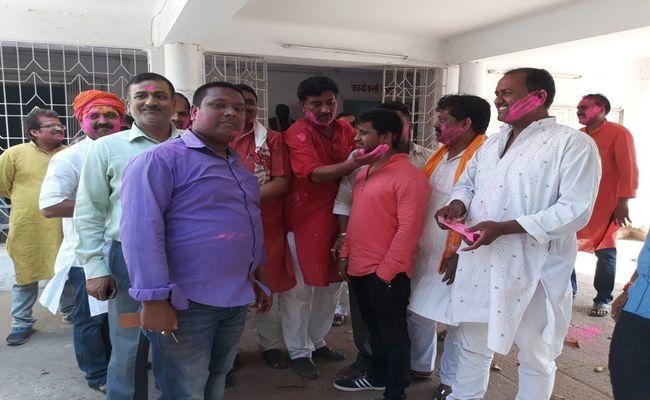 पटना : भारतीय जनता पार्टी के बिहार प्रदेश कार्यालय में एक बार फिर होली मनायी जा रही है. प्रदेश अध्यक्ष नित्यानंद राय के साथ बाकी नेता प्रदेश कार्यालय में भाजपा की बड़ी जीत को सेलिब्रेट कर रहे हैं. पूर्वोत्तर के तीन राज्यों में पार्टी के प्रदर्शन से उत्साहित नेताओं ने जश्न मनाना शुरू कर दिया है. प्रदेश कार्यालय में कार्यकर्ता एक दूसरे को गुलाल लगाकर बधाई दे रहे हैं. सबके माथे पर गुलाल का टीका लगाया जा रहा है. पार्टी कार्यालय में तमाम नेताओं की भीड़ धीरे-धीरे बढ़ती जा रही है.