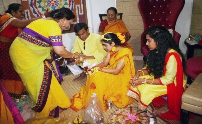 सबसे पहले दुल्हन ऐश्वर्या को उनके घर में चाचियों, भाभी और मौसियों ने पीली साड़ी पहनाकर पूरी तरह से तैयार कर चांदी की चौकी पर बिठाया और चुमावन की प्रक्रिया शुरू हो गयी. ऐश्वर्या की मां पूर्णिमा राय ने अपनी बेटी का चुमावन किया और उसके बाद शादी के पारंपरिक गीत, गंगा जमुनवा के निर्मल पानी शुभे हो, अम्मा रानी ढारेली पानी…, गीत गाया.ऐश्वर्या का चुमावन करने वाली भाभियों ने जमकर उसके साथठिठोली भी कीं और उसे आशीर्वाद दिया. बताया जा रहा है कि घर में हल्दी की रस्म भी चल रही है. जिसमें चुमावन के बाद ऐश्वर्या को में हल्दी लगायी गयी.