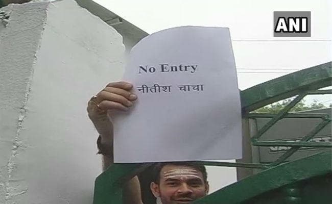 पटना : लालू प्रसाद यादव के बड़े बेटे और पूर्व स्वास्थ्य मंत्री तेज प्रताप यादव का आज नया पॉलिटिकल स्टंट देखने को मिला. तेज प्रताप ने 10 सर्कुलर रोड, पटना स्थित अपनी मां राबड़ी देवी के आवास के गेट पर ‘नो एंट्री चाचा नीतीश’ का पोस्टर लगा दिया. तेज प्रताप ने घर के बाहर खड़े मीडिया कर्मियों से बंद दरवाजे के अन्दर से ही बात की और कहा की चाचा नीतीश के लिए उनके घर में NO ENTRY है.