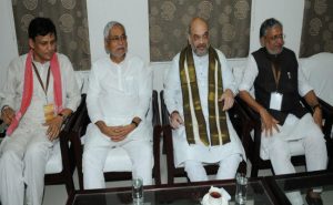 Patna: BJP President Amit Shah meets Bihar Chief Minister Nitish Kumar. Deputy CM Sushil Modi also present pic.twitter.com/byxP745c3A