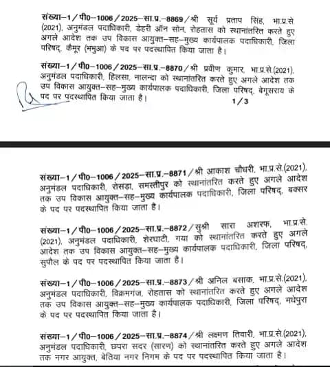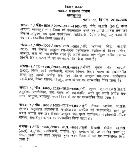 बिहार में 12 IAS और 6 IPS अधिकारियों का तबादला, UPSC टॉपर शुभम को भागलपुर में मिली बड़ी जिम्मेदारी