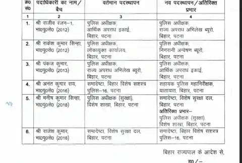 इन अधिकारियों को राज्य के अलग-अलग जिलों में नई जिम्मेदारियां दी गई हैं. माना जा रहा है कि राज्य सरकार की यह कार्रवाई कानून-व्यवस्था को सुदृढ़ बनाने और पुलिस प्रशासन को अधिक प्रभावी बनाने की दिशा में उठाया गया कदम है.