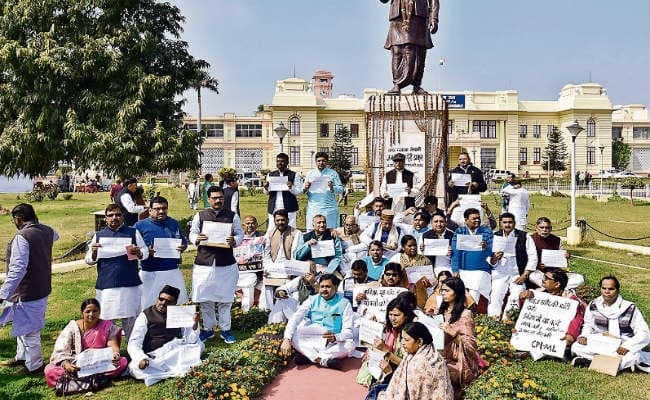 पटना : कर्पूरी ठाकुर की प्रतिमा के पास विपक्षी दलों के सदस्यों ने दिया धरना