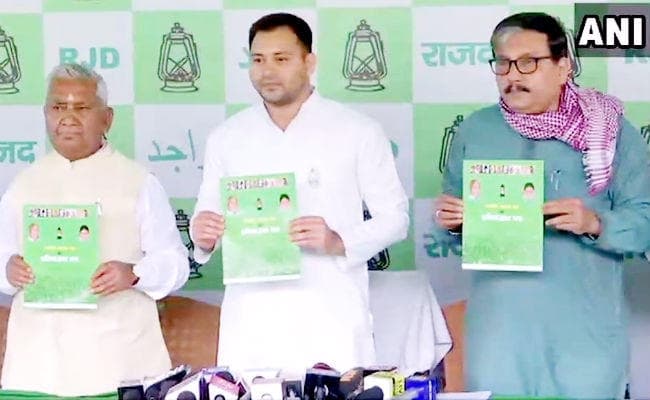 तेजस्वी ने पार्टी कार्यालय में आयोजित संवाददाता सम्मेलन में घोषणापत्र जारी करते हुए कांग्रेस के घोषणापत्र को सही ठहराया. उन्होंने आर्थिक रूप से कमजोर सवर्णों को दिये गये आरक्षण पर कहा कि सवर्ण आरक्षण का लाभ सिर्फ अमीरों को मिला. गरीबों को इसका लाभ नहीं मिला. उन्होंने कहा कि हम सामाजिक न्याय की दिशा में हम मंजिल हासिल करेंगे. उन्होंने कहा कि अगर हमारी सरकार बनी, तो समाज के दबे-कुचले लोगों को मुख्यधारा से जोड़ा जायेगा. साथ ही महागठबंधन में शामिल सहयोगी कांग्रेस की ‘न्याय योजना’ का भी उन्होंने समर्थन किया. तेजस्वी यादव ने रिजर्वेशन के 200 प्वाइंट रोस्टर को लागू करने और सरकारी नौकरी में रिक्त पदों को भरने की बात कही. उन्होंने मीडिया की स्वतंत्रता की बात कहते हुए मीडिया को लोकतांत्रिक व्यवस्था से जोड़ने का काम करने की बात कही. साथ ही उन्होंने ताड़ी खरीदने और बेचना का कानून समाप्त करने की बात कही.