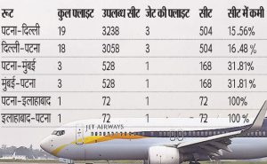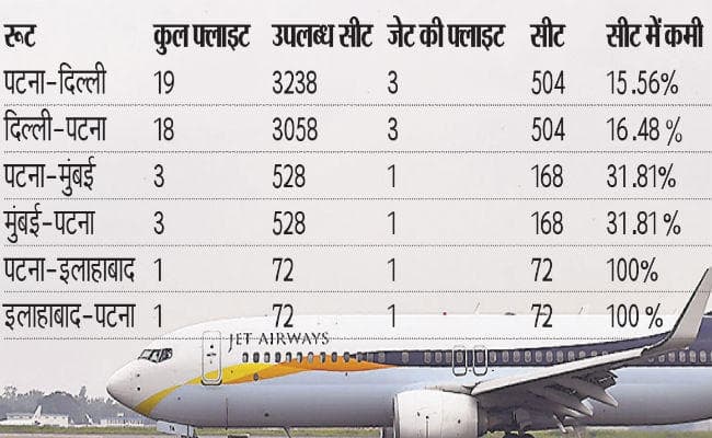 पटना : जेट एयरवेज के आर्थिक संकट का पटना से हवाई सेवा की उपलब्धता पर खराब असर पड़ा है. इससे पटना से दिल्ली रूट पर कुल सीटों में 15% की कमी आयी है, जबकि पटना-मुंबई रूट पर 31% सीटें घट गयी हैं.