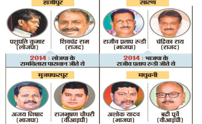 जिन प्रमुख उम्मीदवारों की किस्मत का फैसला इवीएम मेे बंद होगा, उनमें हाजीपुर में राज्य सरकार के मंत्री पशुपति कुमार पारस और राजद के पूर्व मंत्री शिवचंद्र राम, सारण में भाजपा सांसद राजीव प्रताप रूडी और राजद के पूर्व मंत्री चंद्रिका राय, मुजफ्फरपुर में भाजपा सांसद अजय निषाद और वीआइपी के राजभूषण चौधरी, मधुबनी में भाजपा के अशोक यादव, वीआइपी के बद्री पूर्वे और निर्दलीय डॉ शकील अहमद तथा सीतामढ़ी में जदयू के सुनील कुमार पिंटू और राजद के अर्जुन राय शामिल हैं. मुंगेर लाेकसभा क्षेत्र के दो मतदान केंद्रों पर आज दोबारा वोट डाले जायेंगे.