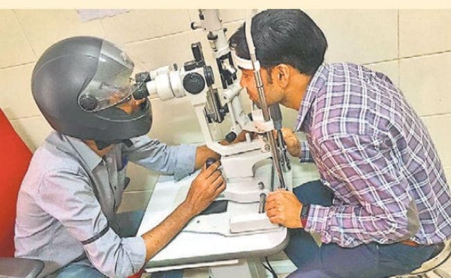 एम्स में हेलमेट लगा कर जांच करते जूनियर डॉक्टर