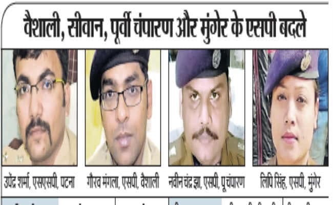सीवान एसपी नवीन चंद्र झा को पूर्वी चंपारण का एसपी, पटना के सिटी एसपी पश्चिमी अभिनव कुमार को सीवान का एसपी, मुंगेर के एसपी गौरव मंगला को वैशाली का एसपी, वैशाली के एसपी जगुनाथ रेड्डी को रेल (एसपी), बाढ़ की एसडीपीओ लिपि सिंह को मुंगेर की एसपी और दानापुर के एसडीपीओ अशोक मिश्र को पटना पश्चिमी का सिटी एसपी बनाया गया है.