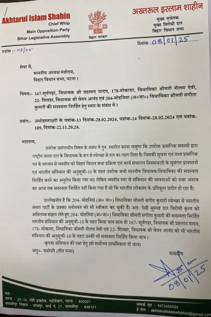 RJD MLA’s News : बिहार विधानसभा में विपक्ष के नेता तेजस्वी यादव इन दिनों में कार्यकर्ता दर्शन और संवाद दौरा कर रहे हैं. आज इसी क्रम में वो बक्सर पहुंचे थे. इसी बीच मुख्य विरोधी दल के मुख्य सचेतक अख्तरुल इस्लाम शाहीन ने बिहार विधानसभा अध्यक्ष को एक पत्र लिखा है. इसमें उन्होंने बताया है कि राजद के चार विधायकों ने अपनी इच्छा से पार्टी को छोड़ दिया है. इसमें प्रहलाद यादव, नीलम देवी, चेतन आनंद और संगीता कुमारी का नाम शामिल है.