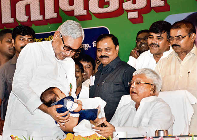पटना :जदयू-राजद-कांग्रेस के बीच सीटों के बंटवारे के दूसरे दिन एक बार फिर मुख्यमंत्री नीतीश कुमार व राजद प्रमुख लालू प्रसाद साझे मंच पर उपस्थित हुए. श्रीकृष्ण मेमोरियल हाल में गुरुवार को केंद्र की नीतियों के खिलाफ आयोजित अति पिछड़ा महासम्मेलन के मंच से नीतीश-लालू ने प्रधानमंत्री नरेंद्र मोदी व भाजपा की जमकर खिंचाई की. दोनों नेताओं ने 30 अगस्त को गांधी मैदान में आयोजित स्वाभिमान रैली में भारी संख्या में लोगों को शामिल होने की अपील की. नीतीश-लालू ने कहा कि बिहार स्वाभिमान रैली बिहार के बारे में ओछी बात करनेवालों को सबक सीखा देगी. मुख्यमंत्री नीतीश कुमार ने कहा कि बिहार अभागा और बीमारू नहीं, सौभाग्यशाली प्रदेश है.