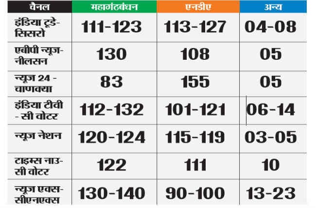 पर बढ़त इतनी कम है कि पांच से दस सीटों के बदलाव से बाजी पलट सकती है. कुल मिला कर एक्जिट पोल भी गोल-मोल परिणाम ही दे सका. एबीपी न्यूज-नीलसन, इंडिया टीवी-सी वोटर, न्यूज नेशन व न्यूज एक्स-सीएनएक्स के एक्जिट पोल के अनुसार प्रदेश में फिर महागंठबंधन की सरकार बनेगी, जबकि इंडिया टूडे-सिसरो व न्यूज 24-चाणक्या के एक्जिट पोल में राज्य की सत्ता में परिवर्तन होगा.