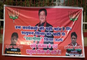 गौर हो किबीतेदिनों भाजपा सांसद शत्रुघ्न सिन्हाद्वारा पार्टी लाइन से अलग हटकरकई बार बयान देने की वजह से विवादों मेंरहेहैं. इसी के मद्देनजर आज उनके विरोध भाजयुमो की ओर से पोस्टर लगायाहै और उनको पार्टी से बाहर निकाले जाने की मांग की गयी है. इससे पहले कीर्ति आजाद को डीडीसीए मामले में वित्त मंत्री अरुण जेटली के खिलाफ बयान दिये जाने को लेकर पार्टीकीआेरसे उनपर कार्रवाईकीजा चुकी है.