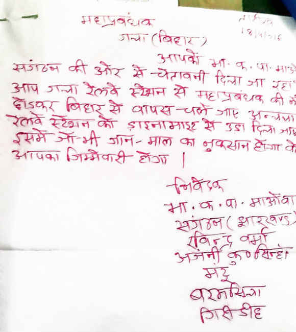 स्टेशन मास्टर को मिला है धमकी भरा पत्र