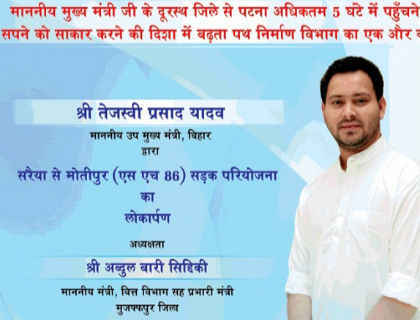 विज्ञापन मुजफ्फरपुर में शुक्रवार को होने वाले सरैंया-मोतीपुर सड़क परियोजना के लोकार्पण से संबंधित है. विज्ञापन में तेजस्वी यादव की बड़ी सी तस्वीर छपी है. विज्ञापन में लिखा हुआ है कि तेजस्वी यादव माननीय मुख्यमंत्री बिहार द्वारा सरैया से मोतीपुर एसएच 86 सड़क परियोजना का लोकापर्ण. अध्यक्षता अब्दुल बारी सिद्दिकी, माननीय वित्त मंत्री और प्रभारी मंत्री मुजफ्फरपुर.