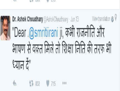 पटना : बिहार के शिक्षा मंत्री अशोक चौधरी और केंद्रीय मानव संसाधन मंत्री स्मृति ईरानी के ट्वीटर पर डियर संबोधन को लेकर हुए विवाद के बाद एक और नया विवाद शुरू हो गया है. मीडिया रिपोर्ट्स के मुताबिक बिहार के शिक्षा मंत्री को ‘निति’ लिखने नहीं आता है. मीडिया में चल रही खबरों के मुताबिक अशोक चौधरी ने शिक्षानीति को ‘निति’ लिख दिया है. उनके लिखे गये शब्दों में मात्रा की गलती है. उन्होंने जो स्मृति ईरानी को ट्वीट किया है, उसमें मात्रा की गलती स्पष्ट देखी जा सकती है. नीचे उनके उस ट्वीट का लिंक है, जो उन्होंने स्मृति ईरानी को किया है.