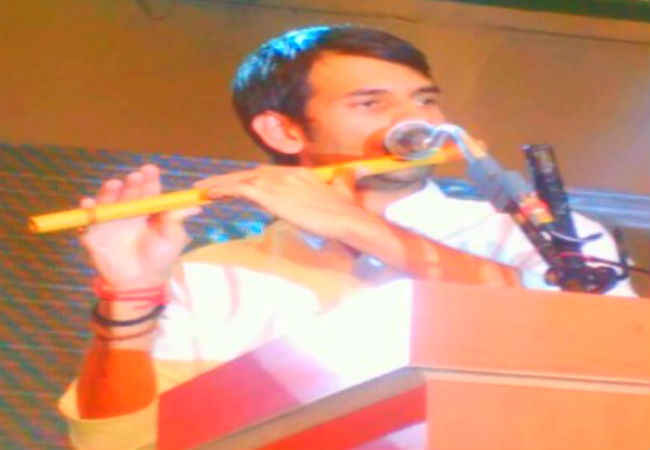 पटना : बिहार सरकार में स्वास्थ्य मंत्री और राजद सुप्रीमो लालू प्रसाद यादव के पुत्र तेज प्रताप यादव का गुरुवार कृष्ण जन्म के दिन लोगों को एक अलग रूप देखने को मिला. अपने विधानसभा क्षेत्र में जन्माष्टमी के अवसर पर आयोजित एक कार्यक्रम में भाग लेने पहुंचे तेज प्रताप ने मंच से जब बांसुरी बजाकर लोगों का मन मोह लिया. लोगों को तब पता चला कि तेज प्रताप बांसुरी भी अच्छा बजा लेते हैं. तेज प्रताप ने बांसुरी पर कृष्ण अराधना की एक तान छेड़ी और उसे उच्च और मध्यम स्वर में मंच से बजाकर लोगों की तालियां बटोरी.