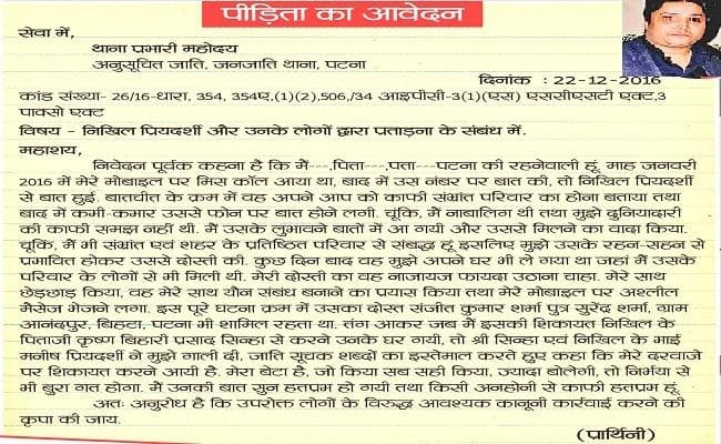 2- उसके बाद उसने मुझसे जबरदस्ती शारीरिक संबंध बनाये तथा उसकी वीडियो रिकार्डिंग कर लिया तथा उसके द्वारा बार-बार ब्लैकमेल करके मेरे साथ शारीरिक संबंध बनाता रहा. इस काम में उसका साथ उसके दोस्त संजीत कुमार शर्मा और उसका भाई मनीष प्रियदर्शी भी दे रहे हैं. तथा सभी लोग में जातिसूचक शब्द का इस्तेमाल करके प्रताड़ित करते रहे.