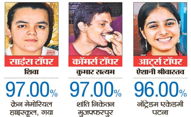 मुस्कान को 98.2% अंक मिले हैं. वहीं क्रेन मेमोिरयल हाइस्कूल, गया की शिवा 97% अंकों के साथ बिहार में टाॅपर बनी है. शिवा साइंस मैथ की छात्रा है. साइंस में पटना के बीडी पब्लिक स्कूल का केशव आनंद को 96.8% अंक मिले हैं. वहीं, कॉमर्स में मुजफ्फरपुर के शांति िनकेतन का कुमार सत्यम स्टेट टॉपर बना है. सत्यम को 97% अंक िमले हैं. डीपीएस पटना की आयुषी प्रताप ने 95.8% अंक हासिल किये हैं. वहीं आर्ट्स में नाट्रेडम एकेडमी, पटना की ऐशानी श्रीवास्तव टॉप रही है. ऐशानी को 96% अंक प्राप्त हुए हैं.