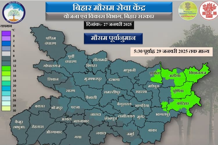 बिहार में अगले 24 घंटे में हल्के से मध्यम गति की पछुआ हवा चलने की स्थिति जारी रहने का पूर्वानुमान है. राज्य के अधिकांश भागों के न्यूनतम तापमान में कोई उल्लेखनीय परिवर्तन की संभावना नहीं है. राज्य के उत्तरी भाग में मध्यम से घना कोहरा छाए रहने की स्थिति जारी रहने की संभावना है. प्रदेश के पश्चिमी चंपारण, पूर्वी चंपारण, सीतामढ़ी, मधुबनी, सुपौल, अररिया, शिवहर और किशनगंज में मंगलवार की सुबह घना कोहरा छाए रहेगा. वहीं पिछले 24 घंटों में प्रदेश में गया जिला के डुमरिया सबसे ठंडा रहा. डुमरिया का न्यूनतम तापमान 6.5 डिग्री सेल्सियस दर्ज किया गया. वहीं सोमवार को मुंगेर जिला के बरियारपुर प्रखंड सबसे ज्यादा गर्म रहा. यहां का अधिकतम तापमान 27.9 डिग्री सेल्सियस दर्ज किया गया.