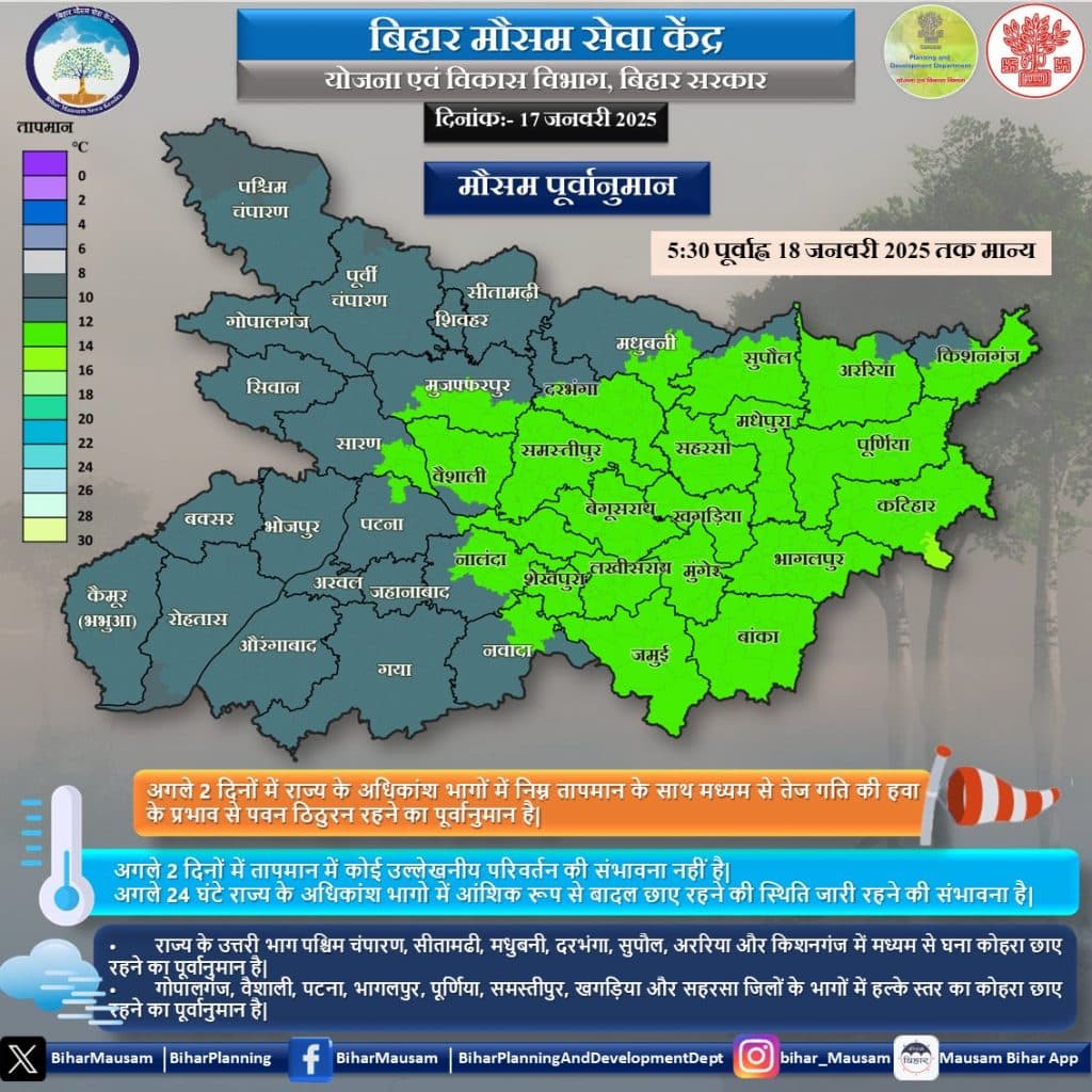 मौसम विभाग ने पूर्वानुमान जारी करते हुए बताया है कि अगले दो दिनों में राज्य के अधिकांश भागों में निम्न तापमान के साथ मध्यम से तेज गति की हवा के प्रभाव से पवन ठिठुरन रहने की संभावना है. अगले दो दिनों में तापमान में कोई परिवर्तन की संभावना नहीं है. अगले 24 घंटे राज्य के अधिकांश भागों में आंशिक रूप से बादल छाए रहने की स्थिति जारी रहने की संभावना है. राज्य के उत्तरी भाग पश्चिम चंपारण, सीतामढ़ी, मधुबनी, दरभंगा, सुपौल, अररिया और किशनगंज में मध्यम से घना कोहरा छाए रहने का पूर्वानुमान है. वहीं गोपालगंज, वैशाली, पटना, भागलपुर, पूर्णिया, समस्तीपुर, खगड़िया और सहरसा जिलों के भागों में हल्के स्तर का कोहरा छाए रहने का पूर्वानुमान है.