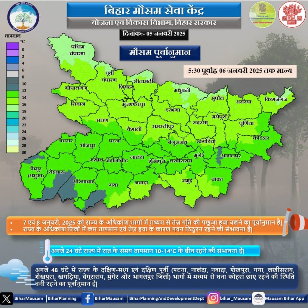 बिहार में अगले 24 घंटे रात के समय तापमान 10 से 14 डिग्री सेल्सियस के बीच रहने की संभावना है. वहीं 7 और 8 जनवरी 2025 को राज्य के अधिकांश भागों में मध्यम से तेज गति की पछुआ हवा चलने का पूर्वानुमान है. राज्य के अधिकांश जिलों में कम तापमान एवं तेज हवा के कारण पवन ठिठुरन रहने की संभावना है. मौसम विभाग के अनुसार अलग 48 घंटे में राज्य के दक्षिण-मध्य एवं दक्षिण पूर्वी पटना, नालंदा, नवादा, शेखपुरा, गया, लखीसराय, शेखपुरा, खगड़िया, बेगूसराय, मुंगेर और भागलपुर जिला के आसपास के भागों में मध्यम से घना कोहरा छाए रहने की स्थिति बनी रहने का पूर्वानुमान है. पिछले 24 घंटों में न्यूनतम तापमान 7.9 डिग्री सेल्सियस बक्सर जिला के चक्की प्रखंड में दर्ज किया गया है. वहीं पिछले 24 घंटे में अधिकतम तापमान 28.0 डिग्री सेल्सियम किशनगंज जिला के किशनगंज और पोठिया प्रखंड में दर्ज किया गया है.