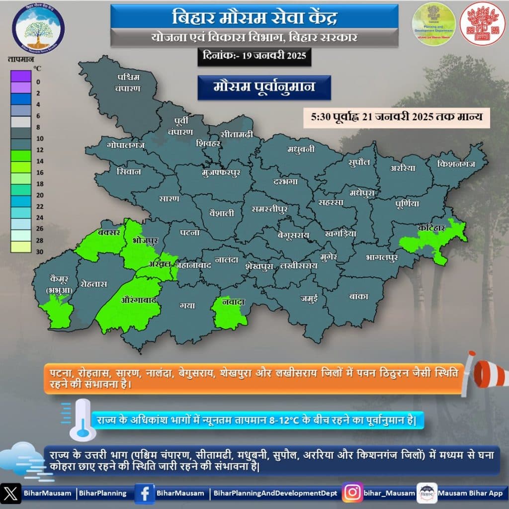 आज पटना, रोहतास, सारण, नालंदा, बेगूसराय, शेखपुरा और लखीसराय जिलों में पवन ठिठुरन जैसी स्थिति रहने की संभावना है. राज्य के अधिकांश भागों में न्यूनतम तापमान 8 से 12 डिग्री सेल्सियस के बीच रहने का पूर्वानुमान है. राज्य के उत्तरी भाग पश्चिम चंपारण, सीतामढ़ी, सुपौल, अररिया और किशनगंज के आसपास के इलाकों में मध्यम से घना कोहरा छाए रहने की स्थिति जारी रहने की संभावना है.
