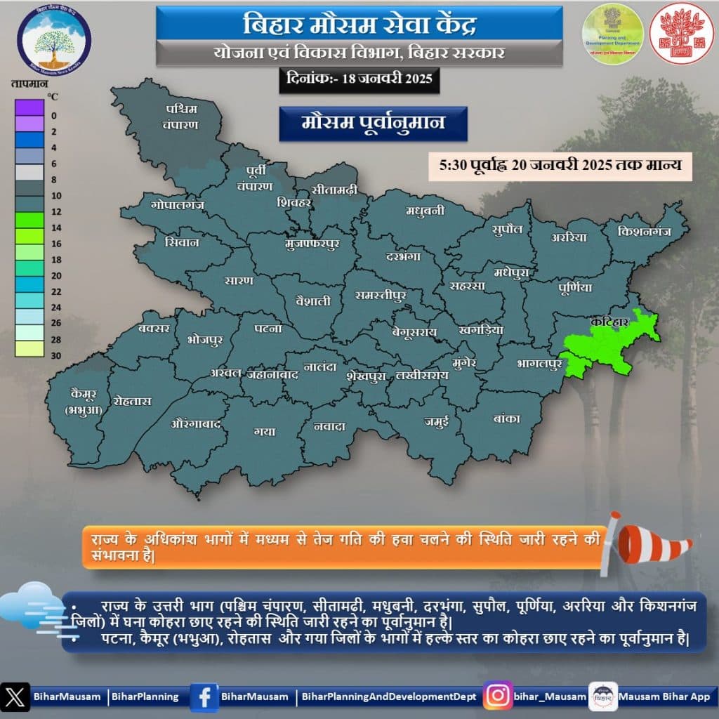 मौसम विभाग के अनुसार, बिहार के अधिकांश भागों में मध्यम से तेज गति की हवा चलने की स्थिति जारी रहने की संभावना है. राज्य के उत्तरी भाग पश्चिम चंपारण, सीतामढ़ी, मधुबनी, दरभंगा, सुपौल, पूर्णिया, अररिया और किशनगंज के आसपास घना कोहरा छाए रहने की स्थिति जारी रहने का पूर्वानुमान है. वहीं पटना, कैमूर, रोहतास और गया जिला के आसपास वाले भागों में हल्के स्तर का कोहरा छाए रहने का पूर्वानुमान है. मौसम विभाग के अनुसार, पिछले 24 घंटों में सबसे ठंडा जिला मुजफ्फरपुर और पूर्वी चंपारण रहा. पिछले 24 घंटों में न्यूनतम तापमान 8.1 डिग्री सेल्सियस पूर्वी चंपारण जिला के मेहसी, कोतवा और अरेराज प्रखंड और मुजफ्फरपुर जिला के बरुराज में दर्ज किया गया है. वहीं हम बात करें अधिकतम तापमान की तो, पिछले 24 घंटों में दर्ज अधिकतम तापमान 24.9 डिग्री सेल्सियस सारण जिला के मशरख प्रखंड में दर्ज किया गया.