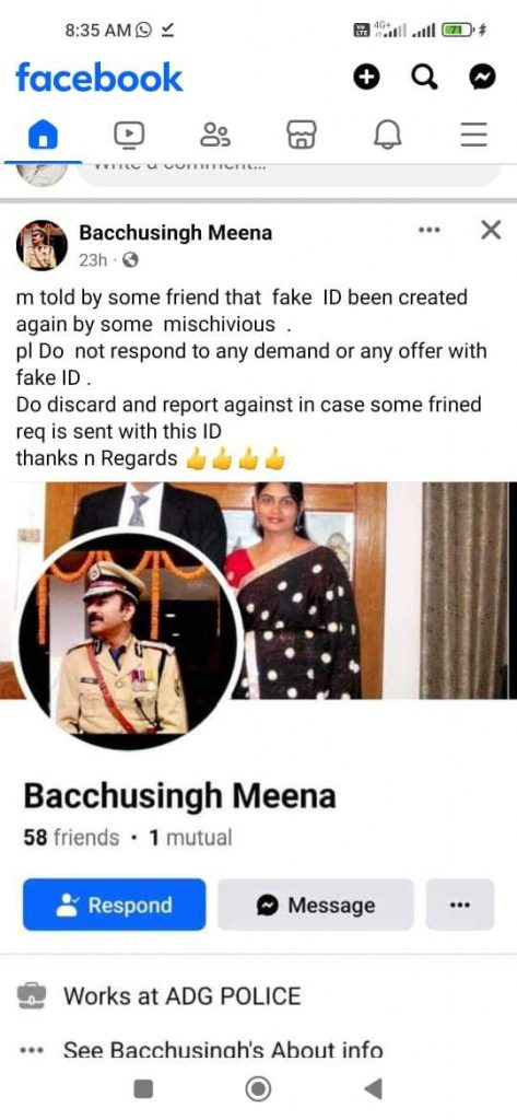 एडीजी बच्चू सिंह मीणा का बनाया फर्जी फेसबुक आइडी