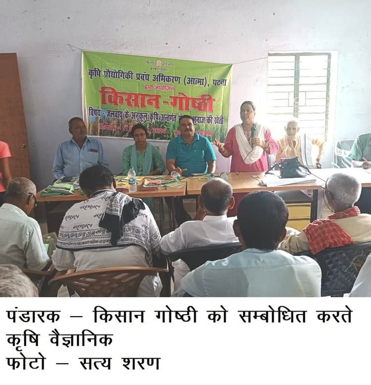 पंडारक. आत्मा के सौजन्य से बुधवार को प्रखंड मुख्यालय स्थित इ किसान भवन में एक दिवसीय किसान गोष्ठी का आयोजन किया गया. कृषि विज्ञान केन्द्र (अगवानपुर) बाढ़ के वरीय कृषि वैज्ञानिक डॉ रीता सिंह , समाज सेवी व कृषक चन्द्रशेखर सिंह, कृषि समन्वयक नीरज कुमार ने कार्यक्रम का उद्घाटन किया. गोष्ठी में जलवायु के अनुकूल पोषक अनाज की खेती विषय पर कृषि वैज्ञानिक डॉ रीता सिंह ने विस्तार से किसानों को जानकारी दी. उन्होंने कहा कि बदलते समय के साथ खेती में नयी तकनीक अपनाकर किसान अधिक उपज कर सकते हैं. उन्होंने कहा कि किसान मोटे अनाज रागी, मक्का, ज्वार, बाजरा, मडुआ की अधिक मात्र में खेती करें, क्योंकि इन फसलों की खेती में पानी का कम मात्रा में प्रयोग होता है. साथ ही उन्होंने किसानों को सलाह दी कि मिट्टी जांच कर ही रासायनिक खाद का प्रयोग करें. इसके बदले जैविक खाद, केंचुआ खाद सहित गोबर का अधिक प्रयोग खेतों में करें. इससे खेतों की उत्पादकता बनी रहेगी. उन्होंने महिलाओं को आर्थिक स्थिति सुधारने के मशरूम की खेती करने पर बल दिया. गोष्ठी के दौरान प्रखंड आत्मा अध्यक्ष नंद कुमार ठाकुर ने अतिथियों का स्वागत किया. इस अवसर पर प्रखंड तकनीकी प्रबंधक ओमप्रकाश तथा सहायक तकनीकी प्रबंधक सरोज अमृत प्रिया ने गोष्ठी को संबोधित किया.