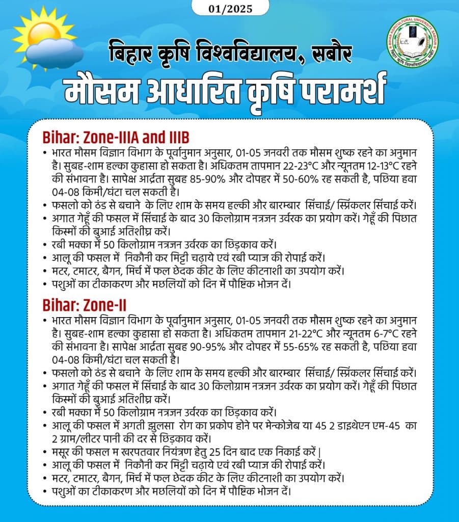 बता दें कि बिहार में मौसम का मिजाज बदल चुका है. पिछले साल में इस बार ठंड का प्रकोप दिसंबर के आखिरी दिनों में भी उस तरह नहीं दिखा जैसा इस महीने में होना चाहिए. लेकिन कुहासे और पछुवा हवा के कारण कनकनी महसूस होती रही. वहीं नए साल के आगमन के साथ ही ठंड में बढ़ोतरी हुई है. किसानों को विशेष सुझाव दिया गया है ताकि उन्हें फसल संबंधित नुकसान नहीं उठाना पड़े. बिहार कृषि विश्वविद्यालय, भागलपुर ने इसे लेकर कृषि सुझाव देना शुरू किया है.