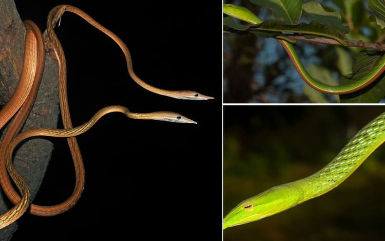 अहेतुल्ला लोंगिरोस्ट्रिस सांप को उसकी लंबी नाक (रोस्ट्रल) और दोहरे रंग के शरीर के कारण पहचाना जाता है. यह सांप हरे या भूरे रंग का हो सकता है, जबकि इसका पेट नारंगी-भूरा होता है. इस सांप के शरीर पर विशेष प्रकार की मोटी कीलदार स्केल्स होती हैं, जो इसे अन्य प्रजातियों से अलग करती हैं. यह सांप मुख्य रूप से पेड़ों पर रहने वाला है और इसमें हल्का विष होता है, जिससे यह अपने शिकार को आसानी से पकड़ सकता है. यह प्रजाति बिहार के वाल्मीकि टाइगर रिजर्व और असम के गुवाहाटी के बाहरी इलाकों में पाई गई है.