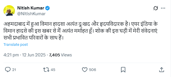 मुख्यमंत्री नीतीश कुमार ने दुख जताते हुए एक्स अकाउंट के जरिये पोस्ट शेयर कर लिखा कि, ‘अहमदाबाद में हुआ विमान हादसा अत्यंत दुःखद और हृदयविदारक है. एयर इंडिया के विमान हादसे की इस खबर से मैं अत्यंत मर्माहत हूं. शोक की इस घड़ी में मेरी संवेदनाएं सभी प्रभावित परिवारों के साथ हैं.’