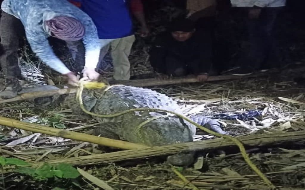 भारत-नेपाल सीमा के वाल्मीकिनगर स्थित टीना शेड कॉलोनी निवासी सुनील कुमार के घर के समीप गुरुवार की देर शाम एक विशालकाय मगरमच्छ को देख परिजनों में घंटों तक अफरा-तफरी मची रही. मृत त्रिवेणी कैनाल से निकल कर विशालकाय मगरमच्छ टीना शेड कॉलोनी निवासी सुनील कुमार के दरवाजे के समीप जा पहुंचा. ग्रामीणों ने तत्काल इसकी सूचना वाल्मीकिनगर स्थित वन कार्यालय को दी. जिसको गंभीरता से लेते हुए वाल्मीकिनगर वन क्षेत्र के रेंजर शिवकुमार राम ने वन कर्मियों की टीम को घटनास्थल पर भेजा. मौके पर वन कर्मियों की टीम घटनास्थल पर पहुंच कर ग्रामीणों की सहयोग कड़ी मशक्कत के बाद विशालकाय मगरमच्छ का सफल रेस्क्यू कर लिया.