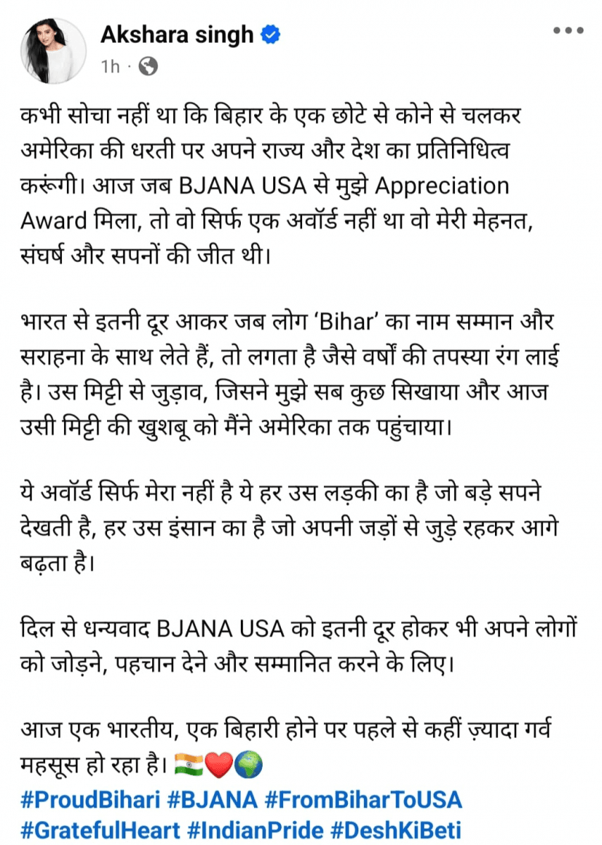 बता दें कि, यह अवॉर्ड भारतीय संस्कृति और भोजपुरी सिनेमा में अक्षरा सिंह के अहम भूमिका को दर्शाता है. वहीं, अवॉर्ड लेने के बाद अक्षरा सिंह ने सोशल मीडिया अकाउंट के जरिये एक पोस्ट शेयर करते हुए काफी कुछ लिखा. अक्षरा सिंह ने लिखा कि, ‘कभी सोचा नहीं था कि बिहार के एक छोटे से कोने से चलकर अमेरिका की धरती पर अपने राज्य और देश का प्रतिनिधित्व करूंगी. आज जब BJANA USA से मुझे Appreciation Award मिला, तो वो सिर्फ एक अवॉर्ड नहीं था वो मेरी मेहनत, संघर्ष और सपनों की जीत थी. भारत से इतनी दूर आकर जब लोग ‘Bihar’ का नाम सम्मान और सराहना के साथ लेते हैं, तो लगता है जैसे वर्षों की तपस्या रंग लाई है. उस मिट्टी से जुड़ाव, जिसने मुझे सब कुछ सिखाया और आज उसी मिट्टी की खुशबू को मैंने अमेरिका तक पहुंचाया.’