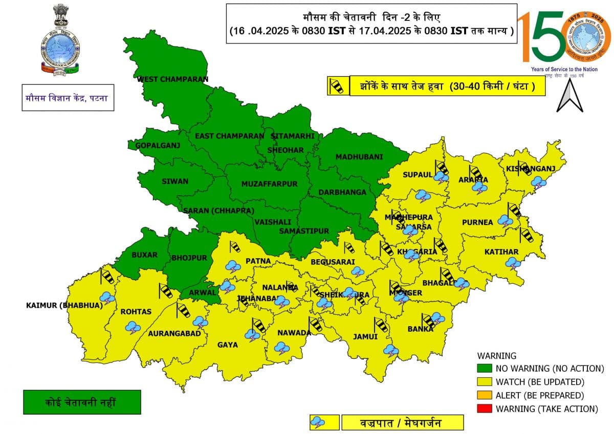 पूर्वी हवा बंगाल की खाड़ी से नमी लेकर बिहार की ओर बढ़ रही है, जिससे प्रदेश में मौसम परिवर्तन के संकेत मिल रहे हैं. 19 अप्रैल तक आंधी, बारिश और वज्रपात की स्थिति बनी रहेगी, खासकर पूर्वी जिलों में एक-दो स्थानों पर भारी बारिश होने की चेतावनी दी गई है. इन इलाकों में तेज गर्जना, वज्रपात और 50 से 60 किलोमीटर प्रति घंटे की रफ्तार से हवा चलने की संभावना है.