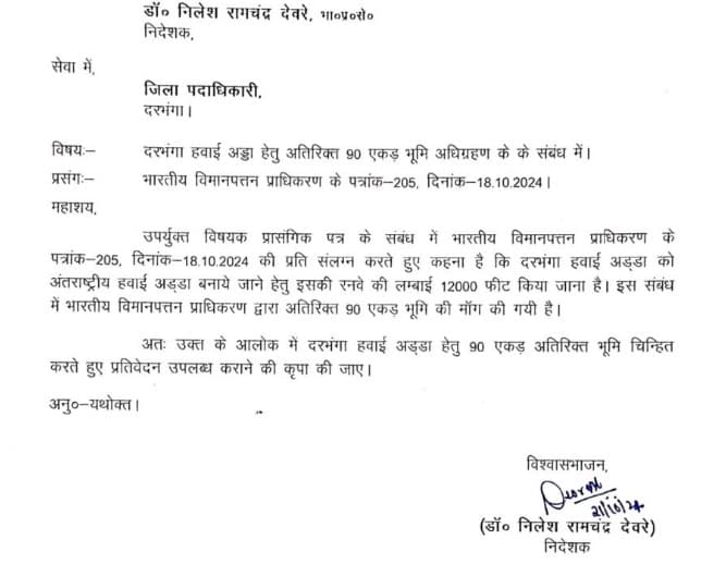Darbhanga Airport: राज्य सरकार ने नये सिविल एन्क्लेव के लिए 54 एकड़ और रनवे का विस्तार कर नाइट लैंडिंग फेसिलिटी स्थापित करने (CAT-1) के लिए 24 एकड़ भूमि के भू-अर्जन की प्रक्रिया पहले ही पूर्ण कर ली है. इसके बाद यह इंटरनेशनल एयरपोर्ट हो जाएगा.