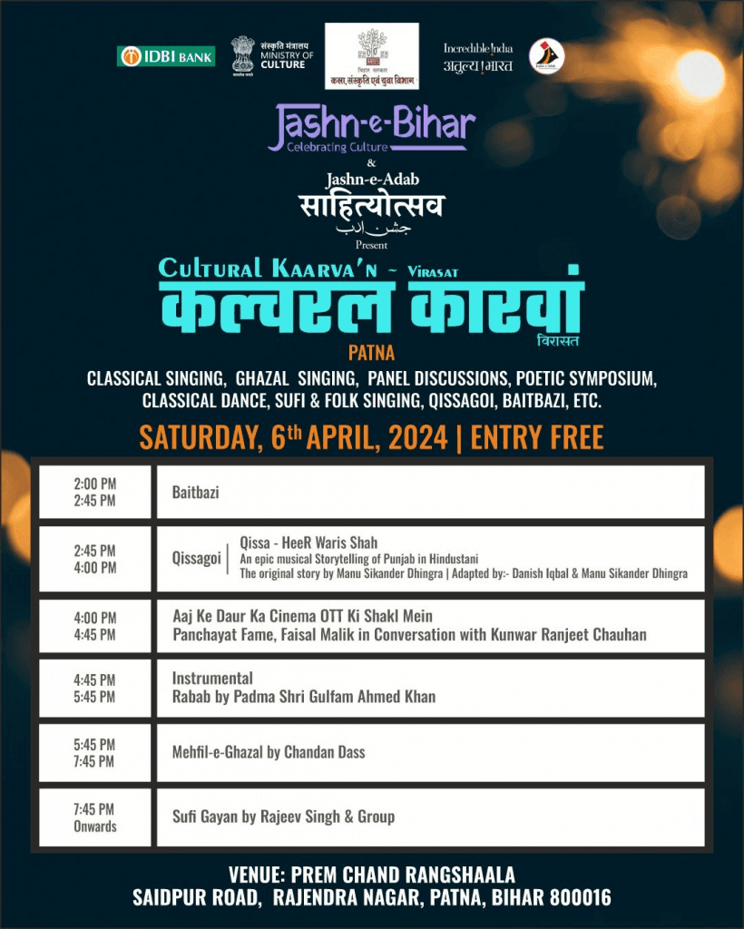 Art & Culture: पटना (बिहार); 5 अप्रैल, 2024; भारतीय कला, संस्कृति और साहित्य के सर्वाधिक मुख्य सांस्कृतिक कार्यक्रमों में से एक, साहित्योत्सव जश्न-ए-अदब सांस्कृतिक कारवां विरासत ‘जश्न-ए-बिहार’ का आयोजन आज से पटना के राजेन्द्र नगर के सैदपुर स्थित प्रेमचंद रंगशाला में शुरू हुआ है. ये कार्यक्रम कल 6 अप्रैल ,2024 (शनिवार) को भी जारी रहेगा जो दोपहर 2 बजे से शुरू होगा. यह सांस्कृतिक उत्सव संस्कृति मंत्रालय (भारत सरकार), पर्यटन मंत्रालय (भारत सरकार) और कला, संस्कृति और युवा विभाग – बिहार सरकार के सहयोग से आयोजित किया जा रहा है. इस ऐतिहासिक सांस्कृतिक कार्यक्रम में देश के विभिन्न हिस्सों से निपुण भारतीय कलाकार भाग ले रहे हैं और प्रदर्शन कर रहे हैं. खुशी की बात ये है कि इस कार्यक्रम मे सभी दर्शकों के लिए प्रवेश शुल्क बिल्कुल मुफ़्त है.
