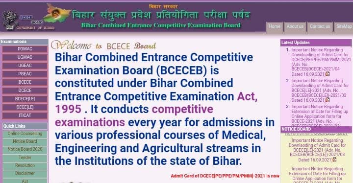 बिहार संयुक्त प्रवेश प्रतियोगिता परीक्षा पर्षद (बीसीइसीइबी) ने पारा मेडिकल व पॉलिटेक्निक में एडमिशन के लिए प्रवेश परीक्षा के लिए सोमवार को एडमिट कार्ड जारी कर दिया गया है. पॉलिटेक्निक व पार्ट टाइम पॉलिटेक्निक की परीक्षा 25 सितंबर को आयोजित की जायेगी.