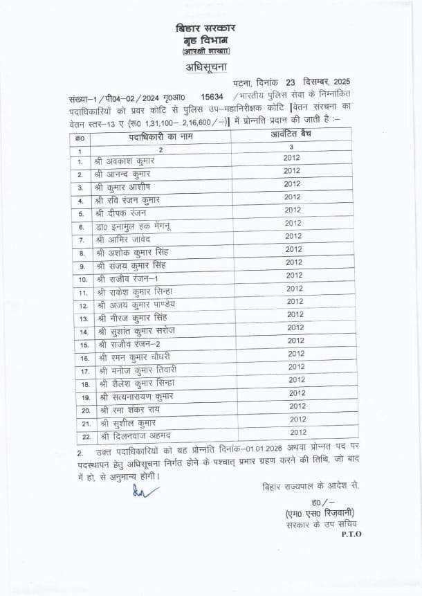 लिस्ट में सबसे बड़ी संख्या 2012 बैच के अधिकारियों की रही है. प्रवर कोटि में कार्यरत 22 आईपीएस अधिकारियों को डीआईजी रैंक में प्रोन्नति दी गई है. इनमें अवकाश कुमार, आनंद कुमार, कुमार आशीष, रविरंजन कुमार, दीपक रंजन, डॉ. इनामुल हक मेंगनू, आमिर जावेद, अशोक कुमार सिंह, संजय कुमार सिंह, राजीव रंजन-1, राकेश कुमार सिन्हा, अजय कुमार पांडेय, नीरज कुमार सिंह, सुशांत कुमार सरोज, राजीव रंजन-2, रमन कुमार चौधरी, मनोज कुमार तिवारी, शैलेश कुमार सिन्हा, सत्यनारायण कुमार, रमाशंकर राय, सुशील कुमार और दिलनवाज अहमद शामिल हैं.