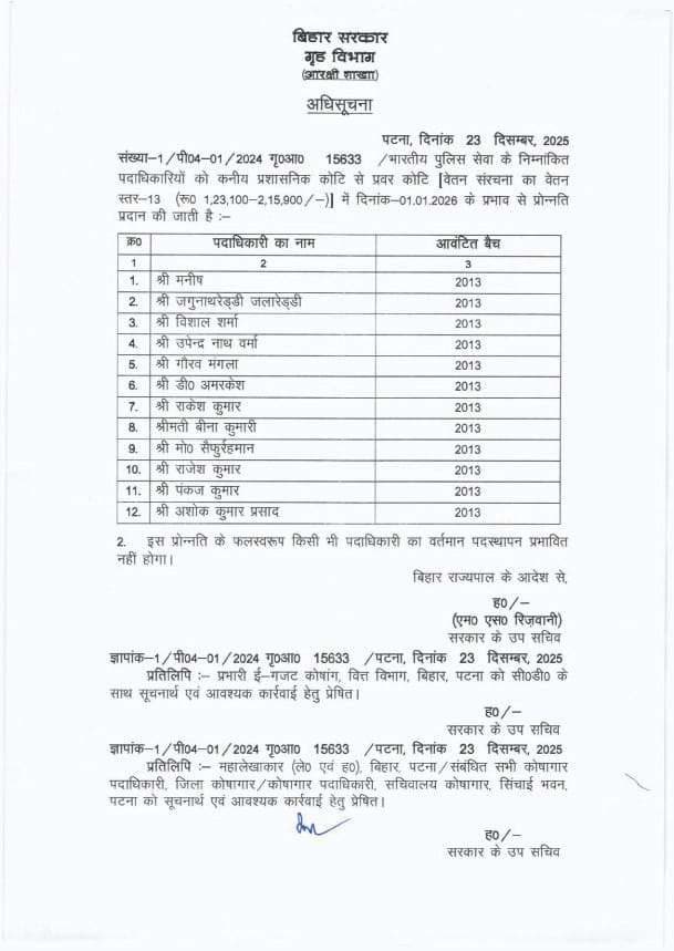 वहीं 2013 बैच के 12 कनीय प्रशासनिक कोटि के आईपीएस अधिकारियों को प्रवर कोटि में प्रोन्नति दी गई है. इनमें मनीष, जगुनाथ रेड्डी जलारेड्डी, विशाल शर्मा, उपेन्द्र नाथ वर्मा, गौरव मंगला, डी. अमरकेश, राकेश कुमार, बीना कुमारी, मो. सैफुर्रहमान, राजेश कुमार, पंकज कुमार और अशोक कुमार प्रसाद शामिल हैं.