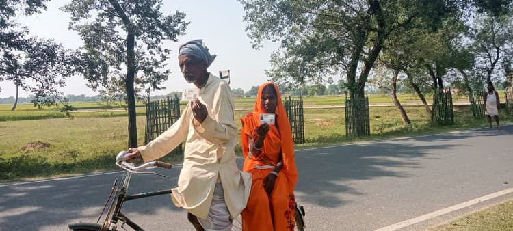 तारापुर: नक्सल प्रभावित बड़की हथिया गांव से 2 किलोमीटर का सफर तय कर लोग वोट डालने आ रहे हैं. तसवीर में बेटा के साथ साइकिल पर सवार होकर मतदान केंद्र पर वोट डालकर वापस लौटते वृद्ध.