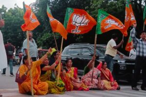 Bihar Bandh: पटना में बीजेपी की महिला कार्यकर्ता झंडा लेकर बीच सड़क पर बैठीं, नारे लगाए- राहुल गांधी होश में आओ