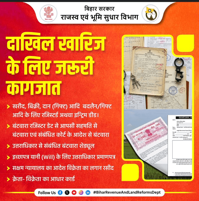 Bihar Bhumi: बिहार सरकार के राजस्व एवं भूमि सुधार विभाग द्वारा जमीन से जुड़े कामों को आसान बनाने के लिए दाखिल-खारिज की प्रक्रिया जरूरी है. दाखिल-खारिज का मतलब है जमीन के मालिक का नाम सरकारी रिकॉर्ड में बदलना. जब जमीन खरीदी जाती है, बेची जाती है, दान में दी जाती है या किसी की मृत्यु के बाद वारिस को जमीन मिलती है, तब दाखिल-खारिज कराना जरूरी होता है.