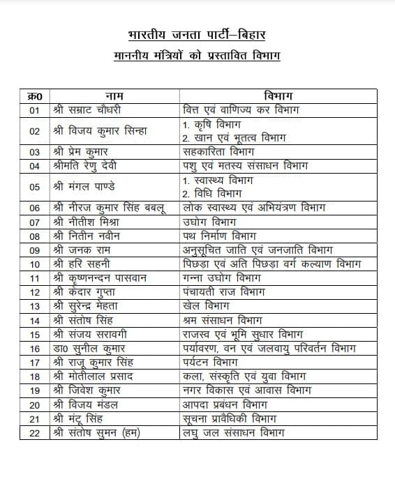 बुधवार को नीतीश कैबिनेट में भाजपा के 7 और विधायकों को शामिल किया गया था. बीजेपी कोटे से 7 नए मंत्री बने. शपथ ग्रहण समारोह संपन्न होने के बाद अगले दिन गुरुवार को इन मंत्रियों के बीच विभागों का बंटवारा कर दिया गया है. इस दौरान नीतीश कैबिनेट में बड़ा फेरबदल भी देखा गया. कई पुराने मंत्रियों के विभाग भी बदले गए हैं.