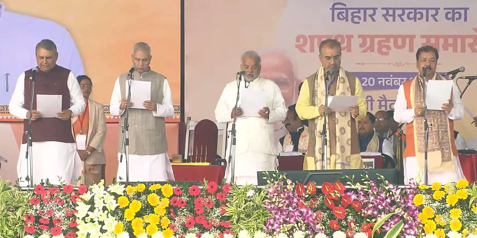 Nitish Kumar Patna Shapath Grahan Samaroh Live: बिहार में नयी सरकार बन गयी है. नीतीश कुमार रिकॉर्ड 10वीं बार बिहार के मुख्यमंत्री पद की शपथ ली. प्रधानमंत्री नरेंद्र मोदी की मौजूदगी में राज्यपाल आरिफ मोहम्मद खान ने उन्हें पद और गोपनीयता की शपथ दिलायी. मुख्यमंत्री के साथ ही उनके कैबिनेट के अन्य सदस्यों को भी शपथ दिलायी गयी. नीतीश कुमार की नयी कैबिनेट में अधिकतर पुराने सदस्य ही शामिल किये गये हैं. हालांकि श्रेयसी सिंह और दीपक प्रकाश जैसे नये चेहरों को भी जगह दी गयी है.