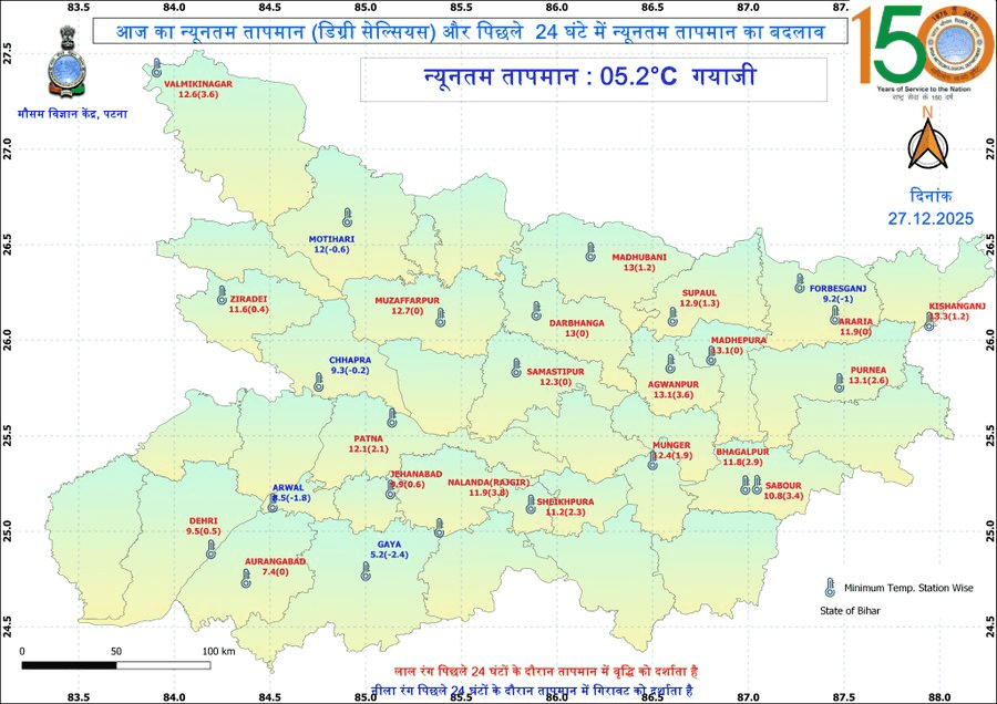 तापमान की बात करें तो बीते 27 दिसंबर को बिहार में इस सीजन का अब तक का सबसे कम तापमान दर्ज किया गया. गया में न्यूनतम तापमान 5.2 डिग्री सेल्सियस रिकॉर्ड किया गया, जो राज्य में सबसे कम रहा. इसके अलावा बिक्रमगंज में 6.3 डिग्री, औरंगाबाद में 7.4 डिग्री, अरवल में 8.5 डिग्री और फारबिसगंज में 9.2 डिग्री सेल्सियस न्यूनतम तापमान दर्ज हुआ.