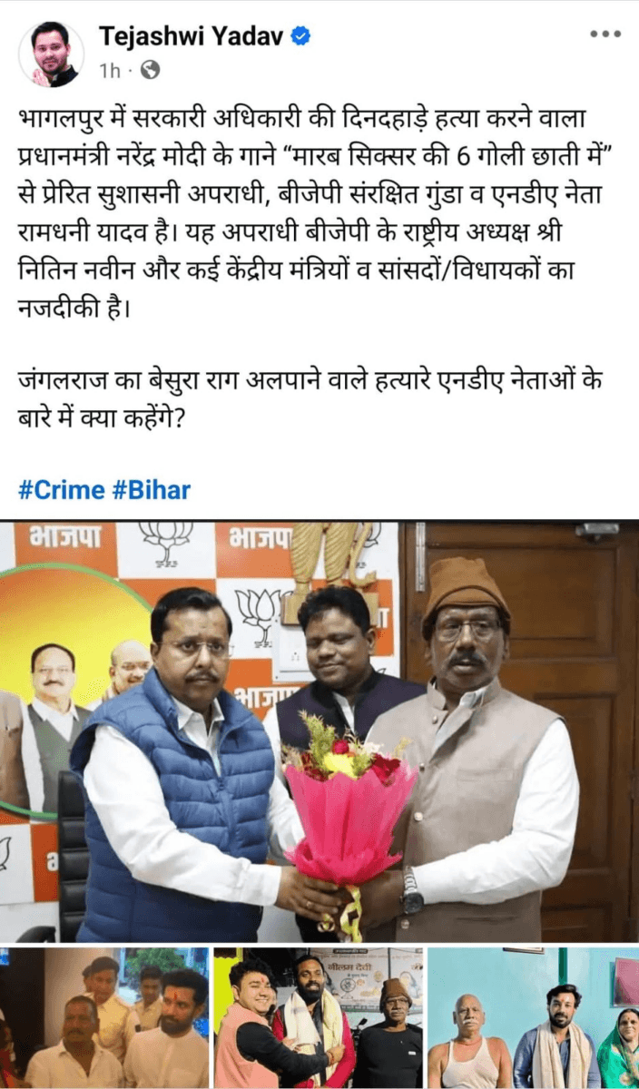 तेजस्वी यादव ने एक्स पर लिखा, ‘भागलपुर में सरकारी अधिकारी की दिनदहाड़े हत्या करने वाला प्रधानमंत्री नरेंद्र मोदी के गाने ‘मारब सिक्सर की 6 गोली छाती में’ से प्रेरित सुशासनी अपराधी, बीजेपी संरक्षित गुंडा और एनडीए नेता रामधनी यादव है. यह अपराधी बीजेपी के राष्ट्रीय अध्यक्ष नितिन नवीन और कई केंद्रीय मंत्रियों और सांसदों/विधायकों का नजदीकी है. जंगलराज का बेसुरा राग अलापने वाले हत्यारे एनडीए नेताओं के बारे में क्या कहेंगे?’