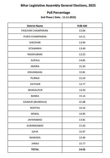 Bihar Election 2025 Live: सुबह नौ बजे तक 14.55 प्रतिशत मतदान